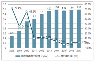 自2011年以后國內端游用戶增長率不斷下滑,在 2015 年甚至出現了小規模負增長,近兩年國內客戶端游戲用戶數量趨于平穩,2017年也并未出現較大波動, 2017年國內客戶端游戲用戶規模達到1.58億人,同比增長1.7%。