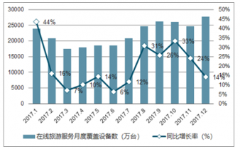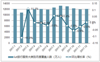 2017年1-12月中國在線旅游服務月度覆蓋人數(shù)及環(huán)比增長率