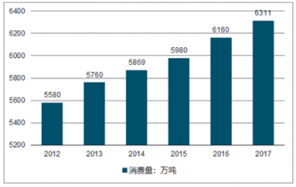2012到2016年,全球棕櫚油的消費(fèi)量以健康穩(wěn)定的速度逐年上升,年均復(fù)合增長(zhǎng)率為2.5%。2016年全球棕櫚油的消費(fèi)量超過(guò)6000萬(wàn)噸,2017年將繼續(xù)增長(zhǎng)突破6300萬(wàn)噸。