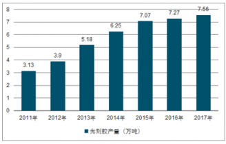 據(jù)統(tǒng)計(jì)資料顯示,2017年中國光刻膠行業(yè)產(chǎn)量達(dá)到7.56萬噸,較2016年增加0.29萬噸。