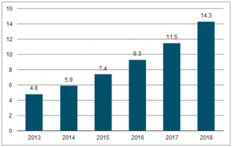 國內(nèi) POCT 起步較晚,具有基數(shù)小、增速快的特點,發(fā)展?jié)摿薮蟆8鶕?jù)數(shù)據(jù)顯示,2013 年我國 POCT 市場規(guī)模為 4.8 億美元,預(yù)計到 2018 年將達(dá)到 14.3億美元,年均復(fù)合增速高達(dá) 24%。