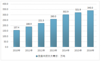 2015年我國國內(nèi)中藥飲片需求量為321.9萬噸,2016年年國內(nèi)需求量增長至340.0萬噸。