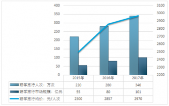 2017年國內(nèi)研學(xué)旅行人數(shù)達(dá)到了340萬人次,市場規(guī)模達(dá)到了101億元。人均消費(fèi)2970元/次。
