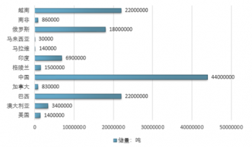 世界稀土資源主要分布在少數(shù)幾個國家,根據(jù)美國地質(zhì)局的數(shù)據(jù)顯示,截止至2017年底,中國稀土儲量達(dá)4400萬噸,排在世界首位,儲量占世界總儲量的36.35%,其次是巴西及越南,儲量達(dá)2200萬噸,占全球總儲量的18.17%;俄羅斯稀土儲量1800萬噸,占全球的14.87%;印度儲量690萬噸,占全球總儲量的5.70%。除上述國家外,稀土在加拿大、澳大利亞、馬來西亞等國家及地區(qū)也有分布。