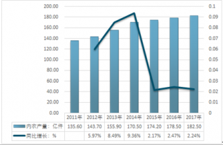 2011-2017年中國內(nèi)衣行業(yè)產(chǎn)量增長情況 |
