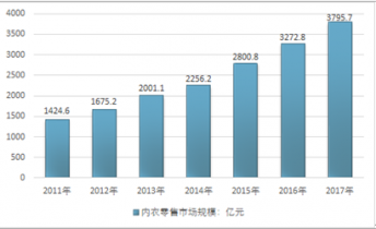 近幾年,我國內(nèi)衣市場規(guī)模快速增長,從2011年的1424.6億元增長到2017年的3795.7億元,近幾年我國內(nèi)衣市場規(guī)模情況如下圖所示: