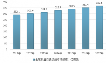 全球軌道交通的不斷發(fā)展,催生了軌道交通運(yùn)維市場(chǎng)廣闊的市場(chǎng)空間,近年來,全球軌道交通運(yùn)維市場(chǎng)保持穩(wěn)定增長(zhǎng)的市場(chǎng)態(tài)勢(shì),2017年全球軌道交通市場(chǎng)規(guī)模增至367.6億美元。