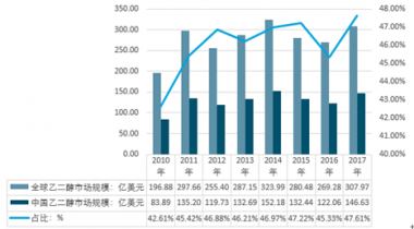 2017年全球乙二醇市場規(guī)模為307.97億美元,中國乙二醇市場規(guī)模為146.63億美元,中國市場占比為47.61%。