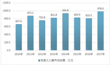 據(jù)統(tǒng)計2016年我國乙二醇市場規(guī)模為810.5億元,2017年我國乙二醇市場規(guī)模達(dá)到978.0億元。