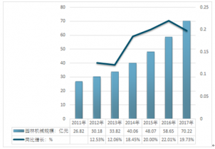 園林機械整個行業隨著園林綠化行業的興起而發展起來。園林機械行業在大部分發展中國家正處于高速發展階段,尤其是在亞洲和南美洲地區。我國園林機械生產起始于20世紀70年代。自90年代以來,隨著市政建設、工業用途和城市園林綠化需求規模的迅速擴大及草坪業的持續發展,帶動了園林機械行業的迅速壯大,我國園林機械產品正在向多樣化、規模化、系列化方向發展。最初國內生產企業生產的園林機械品種只限于移植機、割草機等少數高利潤產品,而現在市場上各種用途的園林機械已是琳瑯滿目。同時,面對歐美園林機械的巨大市場,國內本土產品以其低價、高質等優勢,出口量得以大幅度提高。預測未來幾年,國產園林機械將在國內市場占據主動,并逐步打入國際市場。2017年我國園林機械行業市場規模70.22億元,同比2016年的58.65億元增長了19.73%,近幾年我國園林機械行業市場規模情況如下圖所示: