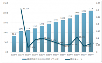 當(dāng)前我國經(jīng)濟(jì)快速發(fā)展,城市化建設(shè)的步伐逐漸加快,對于園林綠化的需求大大增加。2017年中國城市建成區(qū)覆蓋面積約232.5萬公頃,其中建成區(qū)綠地面積約211.6萬公頃,建成區(qū)綠化覆蓋率達(dá)到40.52%。