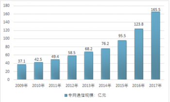 我國專網通信市場近年來一直保持較快增長,2009 年市場規模達到37億元人民幣,但與發達國家相比市場規模還整體偏小,不足美國市場規模的十分之一。隨著中國經濟的高速發展,國家對專網的持續投入,專網通信市場持續高速增長,2017年我國專網通信市場規模增長至165.5億元。