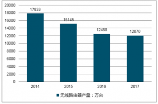 近幾年,我國無線路由器產量呈下降趨勢,2014年,中國無線路由器產量為17833萬臺,到2017年,中國無線路由器行業(yè)產量約12070萬臺,同比2016年的12488萬臺下降了3.35%。