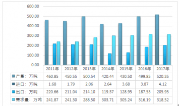 中國玩具產業嚴重依賴出口,受累于全球經濟不穩定,近幾年我國玩具產銷出現不同形式的波動。2017年國內玩具產量為520.35萬噸,需求量為318.52萬噸。