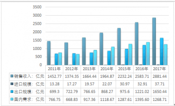 2011年我國玩具行業(yè)銷售收入約2881.44億元,進口金額37.71億元,出口金額約1650.44億元,國內(nèi)玩具銷售市場規(guī)模約1268.71億元。