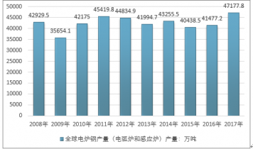 2008-2017年全球電爐鋼(電弧爐和感應(yīng)爐)產(chǎn)量走勢(shì)圖 |