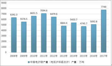 2008-2017年我國電爐鋼(電弧爐和感應(yīng)爐)產(chǎn)量走勢(shì)圖 |