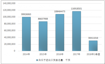 2016年我國白瓜子進出口貿(mào)易總量108464473千克,2017年進出口貿(mào)易總量116918501千克;2019年1季度進出口貿(mào)易總量30411016千克。