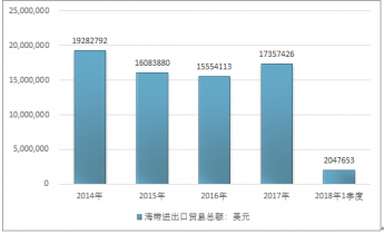 2016年我國海帶進出口貿易總額15554113美元,2017年進出口貿易總額17357426美元;2019年1季度進出口貿易總額2047653美元。