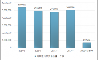 2016年我國海帶進出口貿易總量4790016千克,2017年進出口貿易總量5059986千克;2019年1季度進出口貿易總量692602千克。