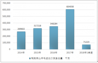 2016年我國制刷用山羊毛進出口貿易總量348284千克,2017年進出口貿易總量604938千克;2019年1季度進出口貿易總量71223千克。