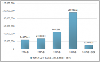2016年我國制刷用山羊毛進出口貿易總額44612681美元,2017年進出口貿易總額95593872美元;2019年1季度進出口貿易總額10307915美元。