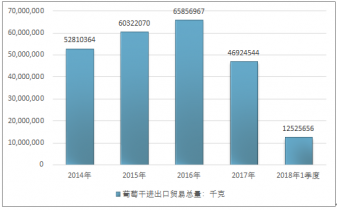 2016年我國葡萄干進出口貿易總量65856967千克,2017年進出口貿易總量46924544千克;2019年1季度進出口貿易總量12525656千克。