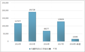 2016年我國(guó)馬黛茶進(jìn)出口貿(mào)易總量68277千克,2017年進(jìn)出口貿(mào)易總量129639千克;2019年1季度進(jìn)出口貿(mào)易總量15590千克。