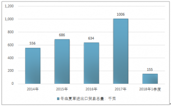 2016年我國(guó)冬蟲(chóng)夏草進(jìn)出口貿(mào)易總量634千克,2017年進(jìn)出口貿(mào)易總量1006千克;2019年1季度進(jìn)出口貿(mào)易總量155千克。