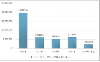 2016年我國(guó)三七(田七)進(jìn)出口貿(mào)易總額5190631美元,2017年進(jìn)出口貿(mào)易總額6218641美元;2019年1季度進(jìn)出口貿(mào)易總額2233160美元。