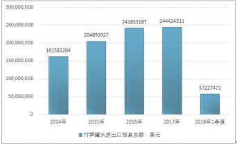 2016年我國竹筍罐頭進出口貿易總額241853187美元,2017年進出口貿易總額244424311美元;2019年1季度進出口貿易總額57227471美元。