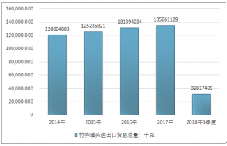 2016年我國竹筍罐頭進出口貿易總量131394034千克 ,2017年進出口貿易總量135061129千克 ;2019年1季度進出口貿易總量32017499千克 。