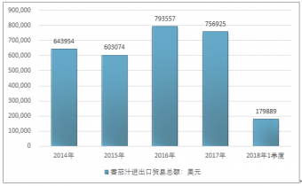 2016年我國番茄汁進出口貿易總額793557美元,2017年進出口貿易總額756925美元;2019年1季度進出口貿易總額179889美元。