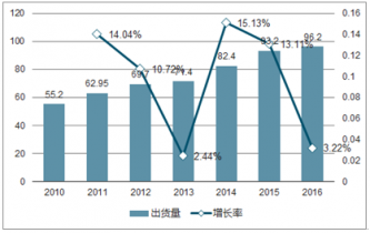 2010-2016年全球智能卡出貨量(單位:億張)