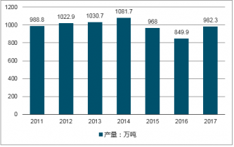 2017年中國食鹽行業產量約982.3萬噸,同比2016年的949.9萬噸增長了3.41%。