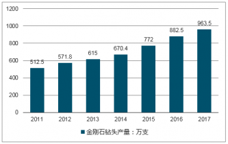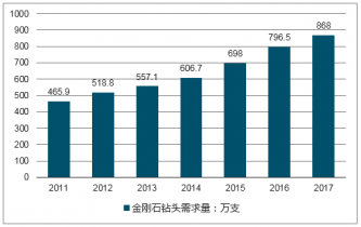 2011年我國金剛石鉆頭行業需求量約465.9萬支,到2017年國內金剛石鉆頭行業需求量達到了868萬支。