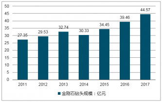 2017年我國金剛石鉆頭行業市場規模約44.57億元,同比2016年的39.46億元增長了12.95%。