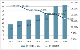 2011-2017年中國醫(yī)用內(nèi)窺鏡設(shè)備進(jìn)口金額及對(duì)外依存度