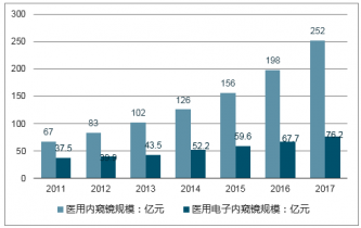 2011-2017年醫(yī)用電子內(nèi)窺鏡規(guī)模(億元)