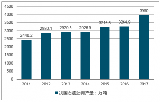2016年我國石油瀝青產(chǎn)量為3264.9萬噸,2017年我國產(chǎn)量增長至3980.0萬噸。