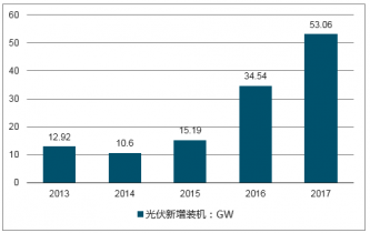2017年,中國光伏發(fā)電新增裝機(jī)為53.06GW,同比增加18.52GW,增速高達(dá)53.62%,再次刷新歷史高位。此外,2017年的新增裝機(jī)還是2016年的1.5倍、2015年的3.5倍、2014年的5陪和2013年的4倍,由此可見2017年光伏新增裝機(jī)出現(xiàn)了大幅快速增長。