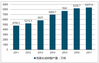 世界三大合成材料包括合成樹脂、合成橡膠和合成纖維,其中合成樹脂是產量和消費量最高的合成材料。自2010年以來,中國合成樹脂產量整體保持穩步增長的態勢,產量均高于4000 萬噸,2017年中國合成樹脂產量達8377.8萬噸。
