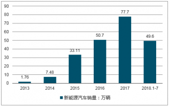 2017年我國新能源汽車累計銷量77.7萬輛;2019年1-7月份我國新能源汽車累計銷量達49.6萬輛,同比增長97%。