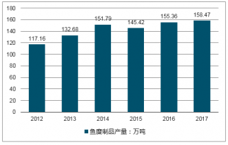 2015年我國魚糜制品產(chǎn)量為145.42萬噸,2016年我國魚糜制品產(chǎn)量為155.36萬噸,2017年行業(yè)產(chǎn)品產(chǎn)量在158.47萬噸左右,魚糜制品滿足國內(nèi)市場需求的同時部分產(chǎn)品出口到國外。