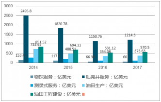 2016年海外物探服務(wù)市場規(guī)模為66.39億美元,鉆完井服務(wù)市場規(guī)模為1150.76億美元,測錄試服務(wù)市場規(guī)模為110.65億美元,油田生產(chǎn)市場規(guī)模為354.08億美元,油田工程建設(shè)市場規(guī)模為531.12億美元。2017年海外物探服務(wù)市場規(guī)模約為60億美元,鉆完井服務(wù)市場規(guī)模為1214.3億美元,測錄試服務(wù)市場規(guī)模為116.76億美元,油田生產(chǎn)市場規(guī)模為373.63億美元,油田工程建設(shè)市場規(guī)模為570.50億美元。