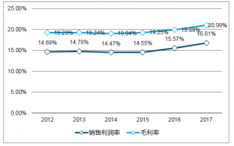 2017年,行業(yè)毛利率為16.81%,銷售利潤率為20.99%,分別上升1.24個百分點和1.10個百分點,說明行業(yè)銷售獲利能力得到改善。