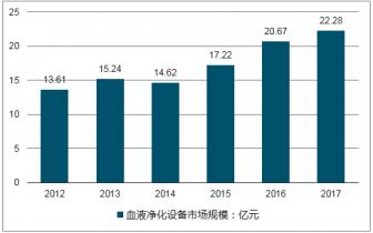 2017年,中國血液凈化設備市場規模達到22.28億元,同比增長7.79%。
