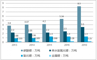 2013-2017年我國鋰鹽工業主要細分產品產量統計