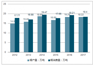 2017年中國(guó)錫產(chǎn)量為18.22萬(wàn)噸,同比下降0.32%;2016年中國(guó)錫產(chǎn)量為18.28萬(wàn)噸。2017年中國(guó)錫消費(fèi)量為18.4萬(wàn)噸,同比下降4.22%;2016年中國(guó)錫消費(fèi)量為18.28萬(wàn)噸。