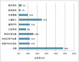 核電項(xiàng)目中設(shè)備投資占比最高。 一臺(tái)百萬(wàn)千瓦的核電機(jī)組的項(xiàng)目工程費(fèi)用可以劃分為土建、設(shè)備采購(gòu)、安裝、調(diào)試、首爐燃料費(fèi)、工程服務(wù)費(fèi)等項(xiàng)目。在這些項(xiàng)目中,設(shè)備投資占比最高,可達(dá)近 40%-50%。 此外, 承擔(dān)核電新技術(shù)示范的項(xiàng)目由于對(duì)設(shè)備要求的升級(jí)以及進(jìn)口比例的提升,設(shè)備投資的占比還將會(huì)所有提高。